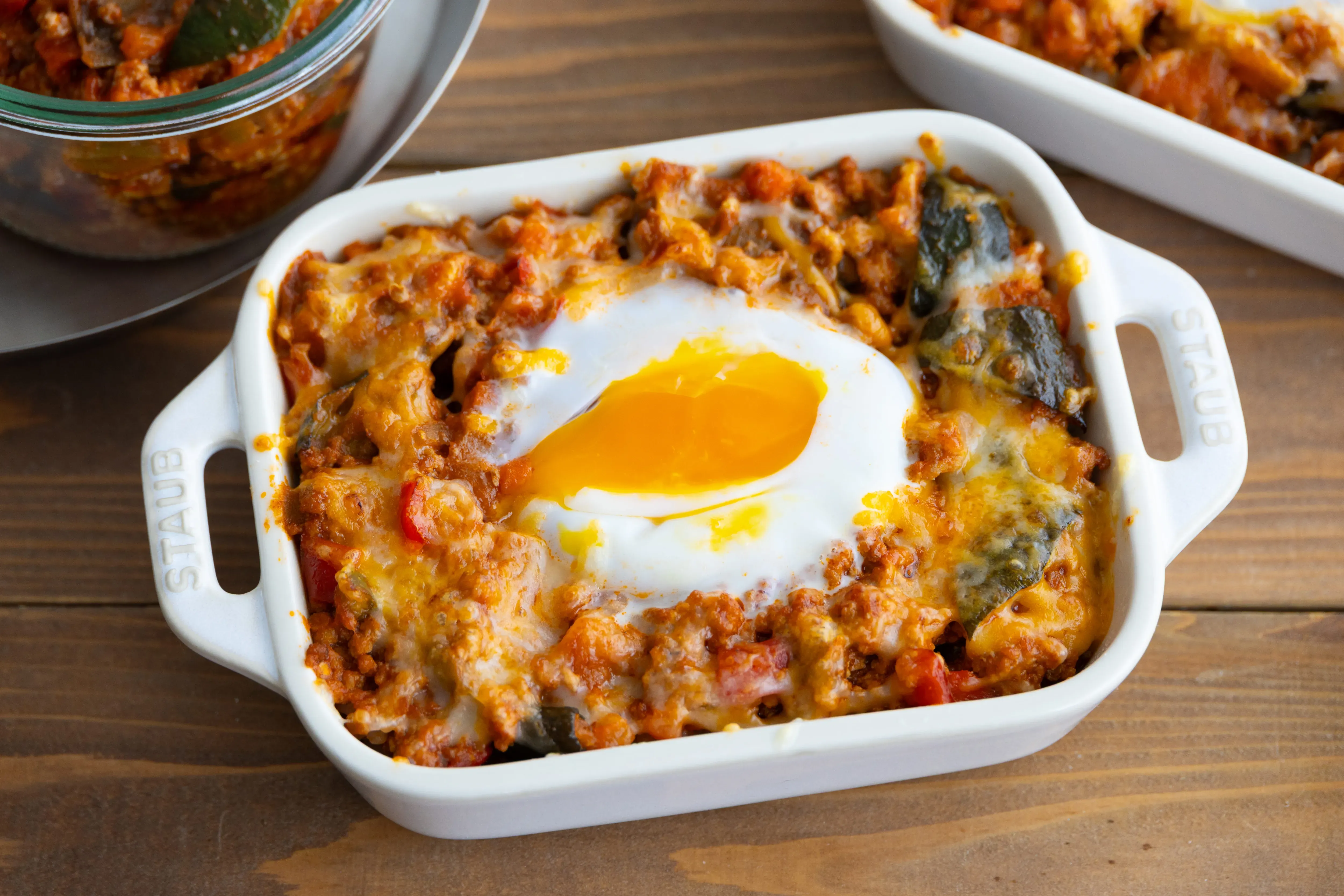 材料:2人分 パスタやご飯に!ボロネーゼ 適量 A:ごはん 300g A:バター(有塩・無塩どちらでも) 20g A:コンソメ(顆粒) 小さじ½ A:塩 適量 ピザ用チーズ 適量 卵 2個 バター(グラタン皿へ塗る用) 適量