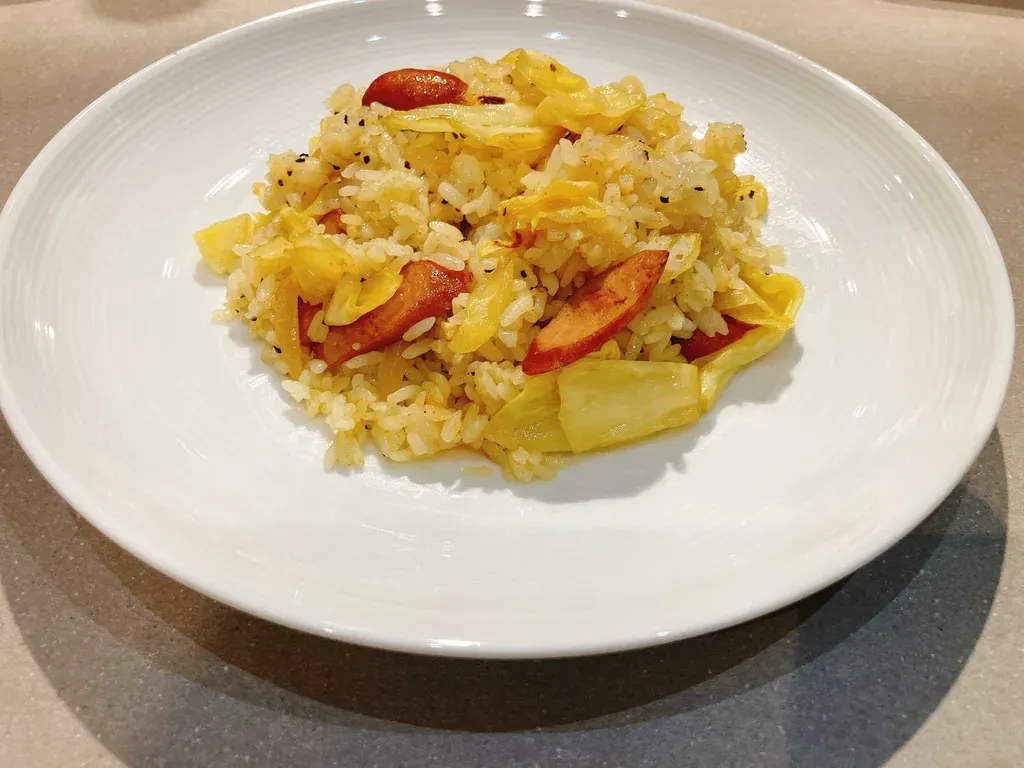 材料(1人分) キャベツとソーセージのカレー炒め・・・1/2程度(お好みで) 白ごはん・・・150g〜200g程度 鶏ガラスープの素・・・小さじ1/2程度 (スプーン1杯の水で溶いておく) こしょう・・・少々