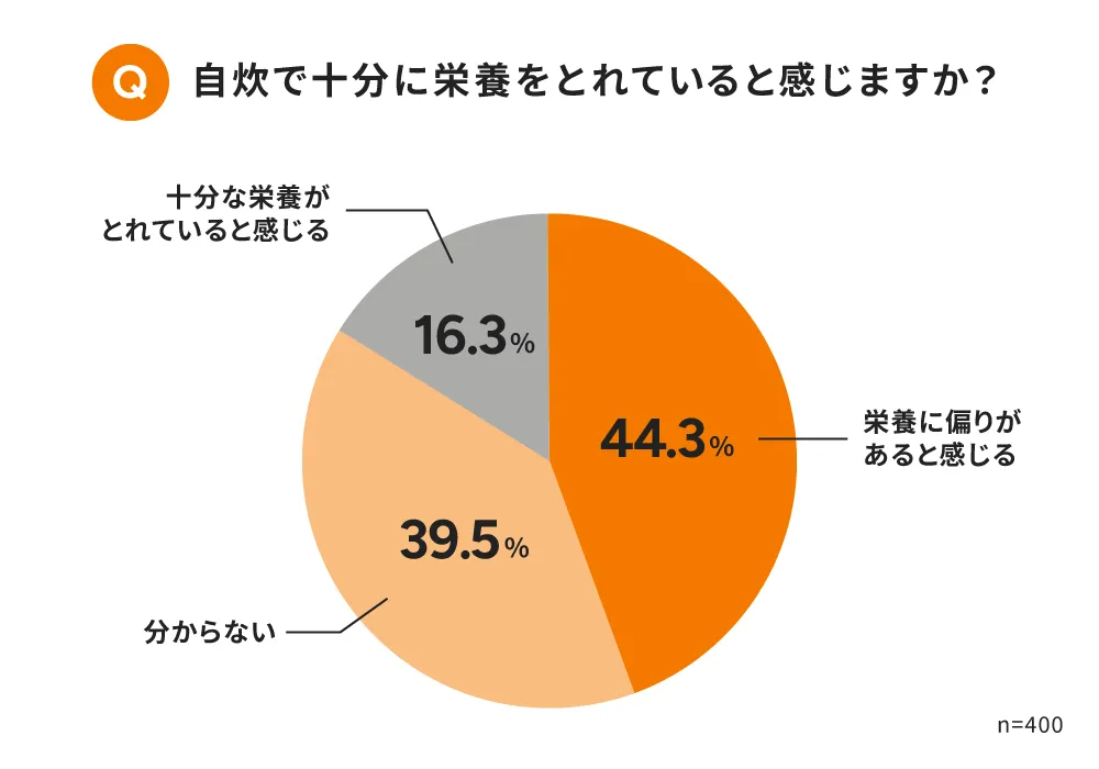 一方で、「自炊で十分に栄養をとれていると感じますか?」という質問に対しては、80%以上が「栄養に偏りがあると感じる」「分からない」と回答。理想と現実のギャップが浮き彫りになっています。